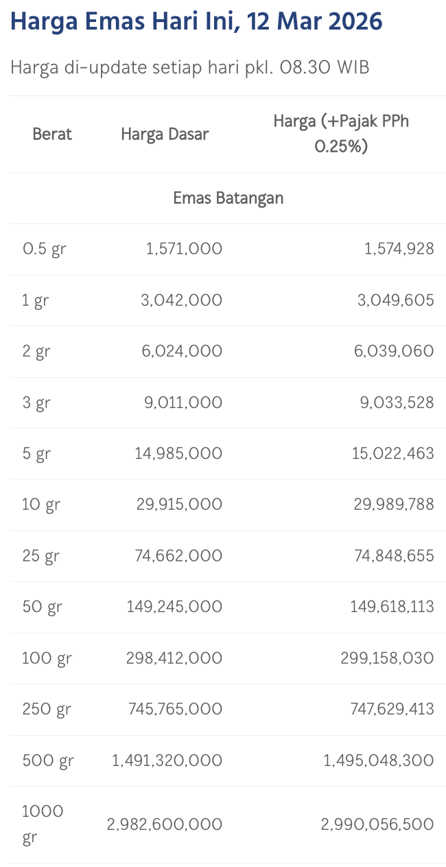 Pada Kamis (12/3/2026), emas Antam dihargai Rp 3.042.000/gram. Melemah Rp 45.000 dari posisi kemarin.