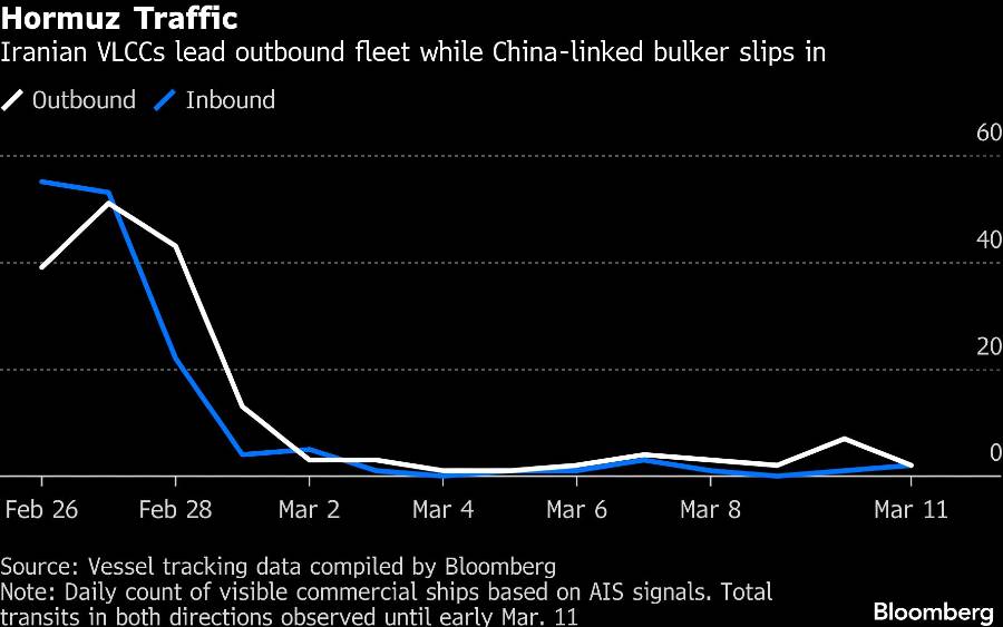 Ada delapan transit komersial pada Selasa dan empat lagi teridentifikasi pada Rabu pagi, sebagian besar di antaranya terkait dengan Iran atau memiliki hubungan komersial dengan China, menurut data pelacakan kapal yang dikumpulkan Bloomberg.