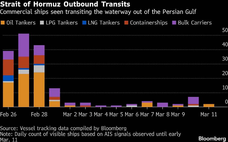 Dua kapal tanker VLCC Iran yang dikenai sanksi, terlihat meninggalkan Teluk Persia menuju Asia pada Rabu pagi. Kedalaman lambung kapal menunjukkan bahwa kedua supertanker tersebut penuh muatan. Menurut Tankertrackers.com, perusahaan yang mengkhususkan diri dalam penggunaan citra satelit untuk melacak kapal, sebanyak 13,7 juta barel minyak mentah Iran telah dikirim melalui selat sejak perang dimulai pada 28 Februari.