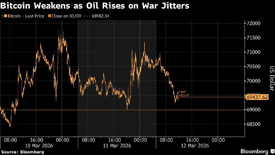 Bitcoin turun hingga 2% setelah serangan terhadap dua kapal tanker minyak di perairan Irak dan tetap berada di sekitar US$69.600 pada siang hari, dengan pergerakan minyak Brent melonjak hingga 10,5%, memicu sentimen risk-off di pasar, termasuk saham.