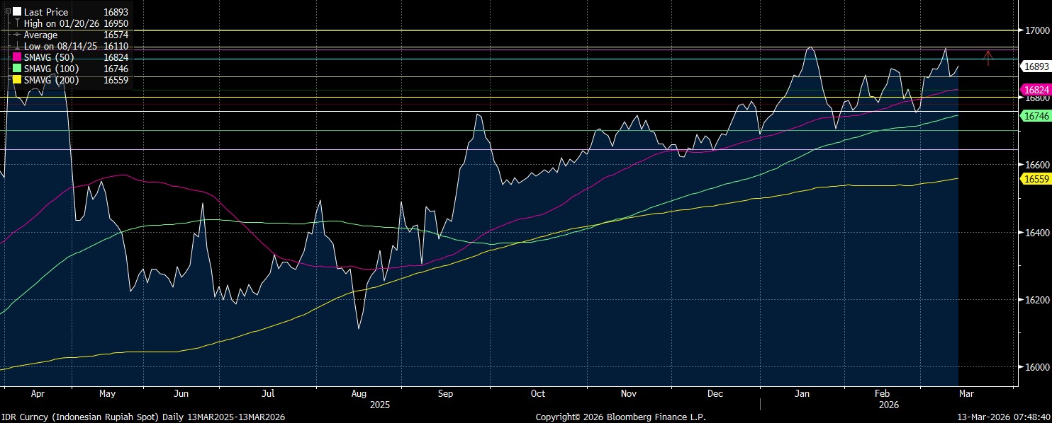 Dengan kenaikan harga minyak mentah yang bertahan lama akibat ketidakpastian durasi perang, rupiah kembali menghadapi sentimen risk-off. Selain itu, kenaikan minyak juga dapat memicu imported inflation alias kenaikan harga barang dan jasa yang disebabkan oleh pelemahan nilai tukar rupiah.