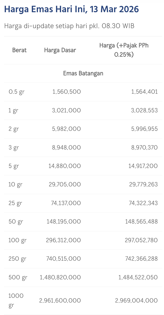 Pada Jumat (12/3/2026), emas Antam dihargai Rp 3.021.000/gram. Melemah Rp 21.000 dari posisi kemarin.