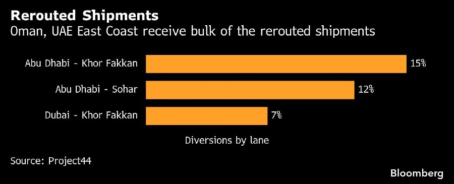 Pelabuhan Khor Fakkan, terminal kontainer utama UAE di Teluk Oman, menyerap jumlah pengiriman yang dialihkan terbesar dari Abu Dhabi dan Jebel Ali. Sohar, pelabuhan industri utama Oman, yang terletak kurang dari 200 kilometer selatan Selat Hormuz, juga menerima beberapa kapal yang dialihkan, menurut data dari platform rantai pasokan Project44.