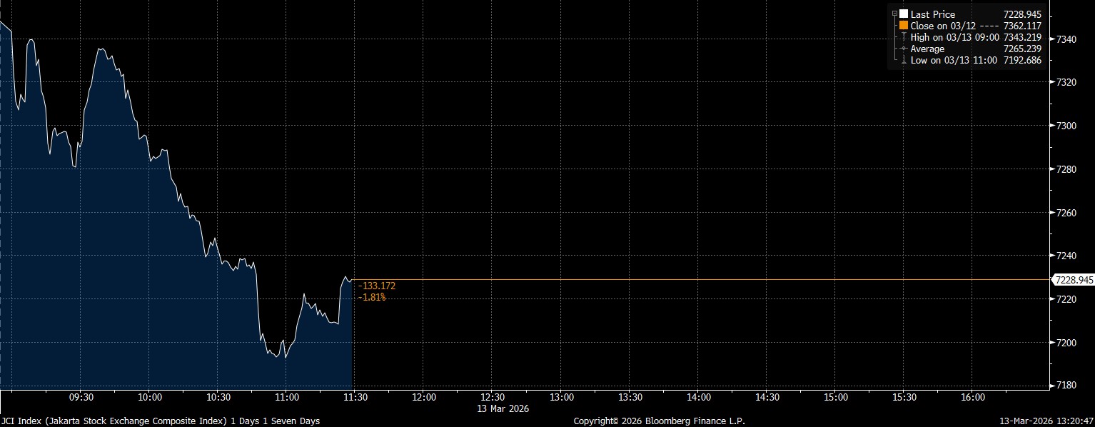 Bloomberg Technoz, Jakarta - Indeks Harga Saham Gabungan (IHSG) amblas 1,81% ke level 7.228 pada perdagangan sesi I Jumat (13/3/2026). Indeks komposit sempat melorot 2% lebih menuju level terendah 7.188.