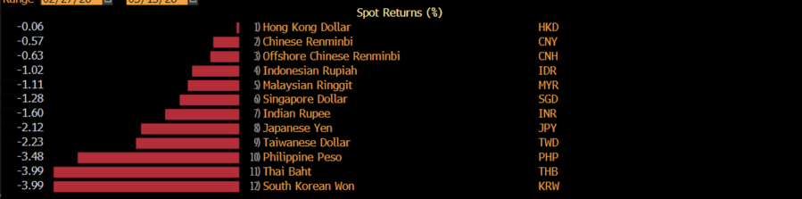 Tekanan dari dolar AS telah terasa di hampir semua aset di pasar negara berkembang, tak terkecuali rupiah. Sejak awal Maret akhir pekan lalu, mata uang Asia melemah tajam. Won Korea Selatan, baht Thailand, dan peso Filipina yang paling terpukul dengan pelemahan sebanyak hampir 4%.