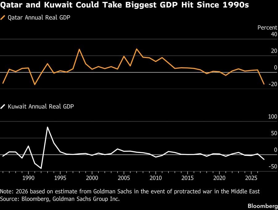 Qatar dan Kuwait masing-masing berpotensi mengalami kontraksi produk domestik bruto (PDB) sebesar 14% tahun ini jika konflik berlanjut hingga April, yang mengakibatkan penutupan Selat Hormuz selama dua bulan, menurut ekonom Goldman Sachs Group Inc., Farouk Soussa.