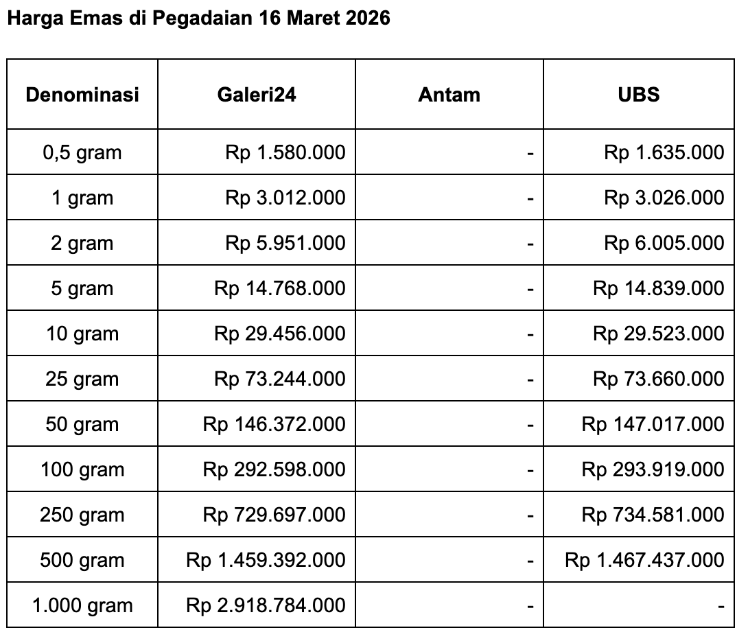 Lalu untuk emas batangan Galeri 24 ukuran 0,5 gram, Pegadaian menjual di harga Rp 1.580.000. Adapun untuk ukuran 1 gram, harga emas Galeri 24 di Pegadaian adalah Rp 3.012.000.