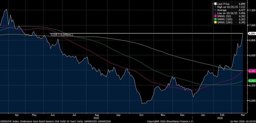 Bloomberg Technoz, Jakarta - Pasar surat utang Indonesia sedang menghadapi pekan yang penuh gejolak. Pada Senin (16/3/2026) imbal hasil (yield) surat utang negara (SUN) bertenor 10Y, yang menjadi acuan utama bagi investor, naik 9,2 basis poin (bps) ke 6,89%. Kenaikan yield ini menandakan tekanan aksi jual dan menjadi posisi tertinggi sejak Mei tahun lalu.
