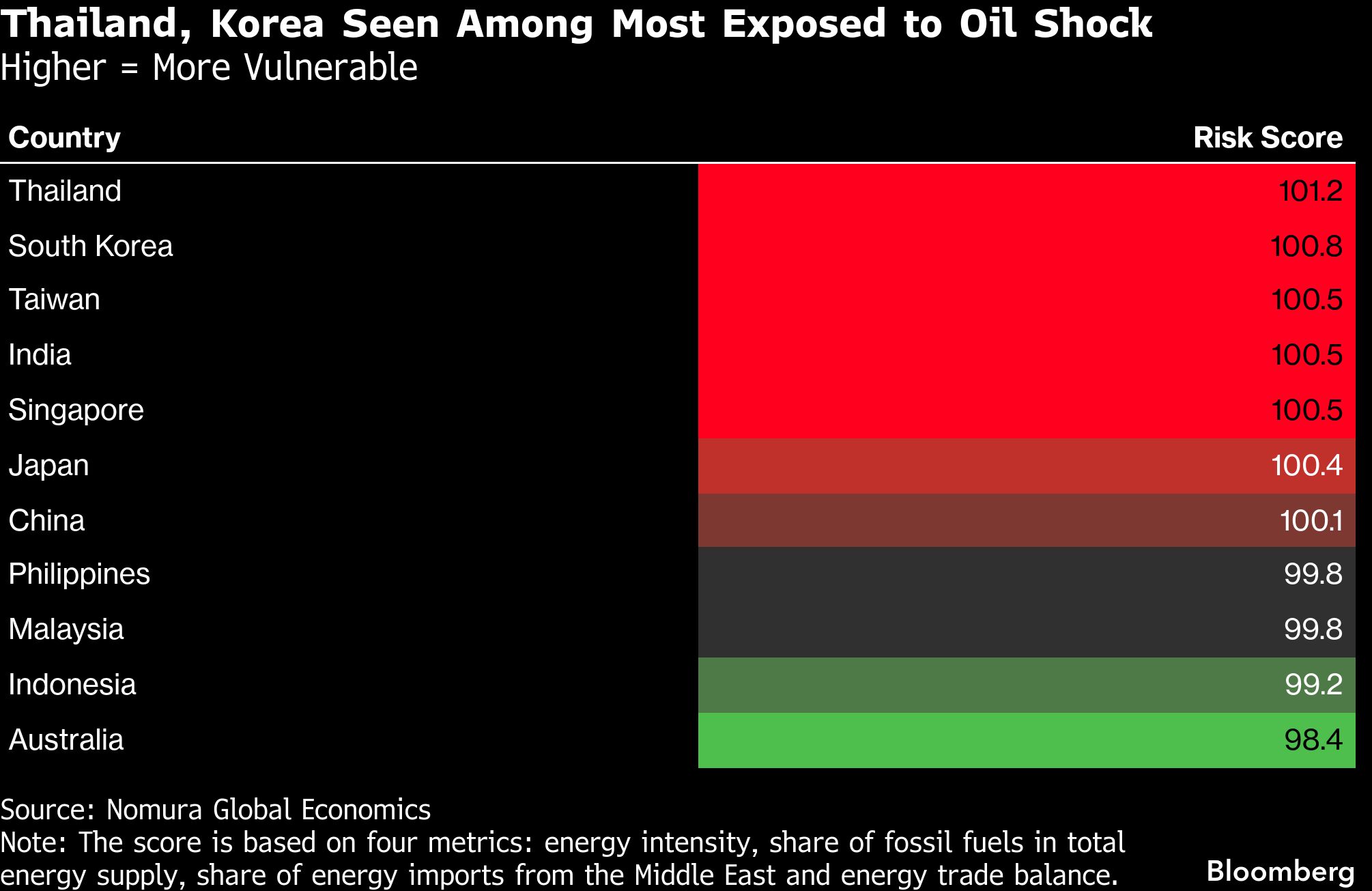 Berdasarkan perhitungan Nomura, Thailand jadi negara paling rentan, paling rawan. Skor Negeri Gajah Putih mencapai 101,2. Makin tinggi nilainya, maka makin rapuh suatu negara menghadapi kenaikan harga minyak.