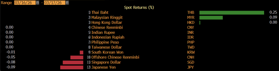 Penguatan terjadi pada baht Thailand, ringgit Malaysia, dan dolar Hong Kong. Sebaliknya, yen Jepang, dolar Singapura, dan yuan offshore China kembali tergelincir.