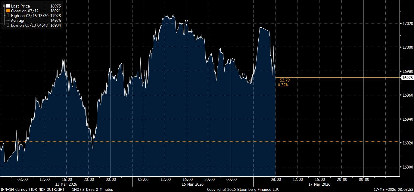 Pagi ini, Selasa (17/3/2026), rupiah offshore dibanderol Rp16.975/US$ saat pembukaan perdagangan. Namun satu jam setelah pembukaan rupiah sempat melemah dan menyentuh Rp17.016/US$ pada 05:24 WIB, lalu kembali menguat terbatas 0,3% menjadi Rp16.981/US$ pada 07:20 WIB.