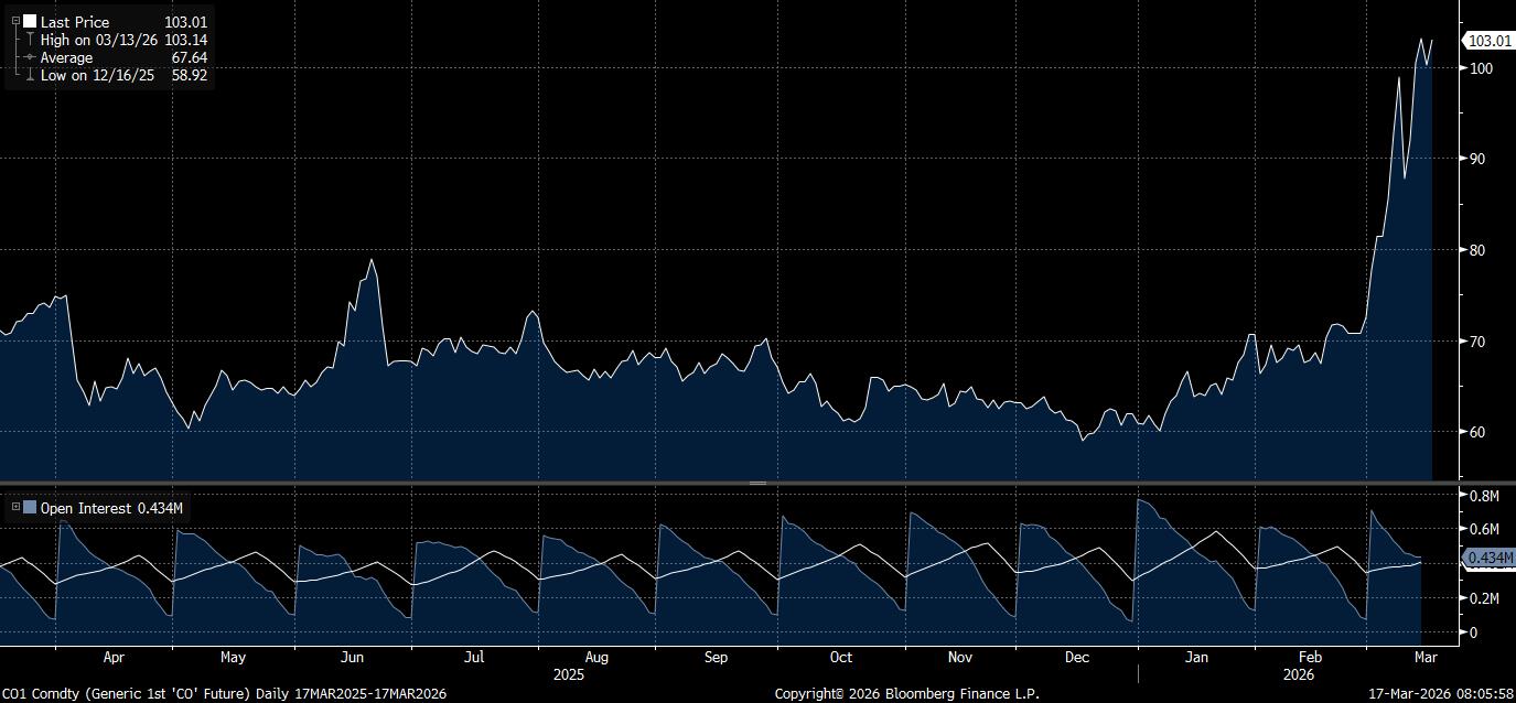 Minyak Brent untuk pengiriman Mei naik 2,8% menjadi US$103,04/barel pada pukul 10:18 pagi ini di Singapura.