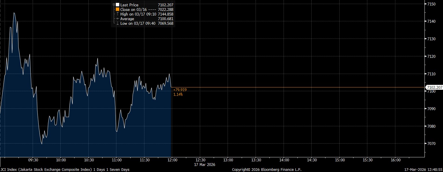 Bloomberg Technoz, Jakarta - Indeks Harga Saham Gabungan (IHSG) ditutup menguat hingga melesat di zona hijau, terapresiasi 1,14% di posisi 7.102,2 pada Selasa (17/3/2026) Sesi I jelang pengumuman kebijakan suku bunga acuan BI Rate, usai Bank Indonesia menggelar Rapat Dewan Gubernur (RDG) dua hari ini.