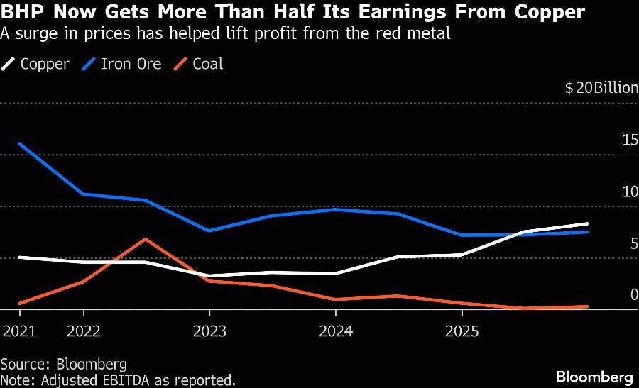 Sebagai gantinya, BHP semakin fokus pada opsi pertumbuhan yang sudah ada, termasuk potasium, bahan baku utama pupuk, dan tembaga, yang sangat penting untuk transisi energi dan tren teknologi yang didorong oleh AI. Logam merah tersebut menyumbang lebih dari setengah laba BHP untuk pertama kalinya dalam enam bulan hingga Desember.