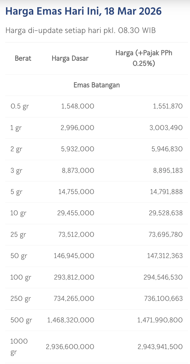 Pada Rabu (18/3/2026), emas Antam dihargai Rp 2.996.000/gram. Menguat Rp 8.000 dari posisi kemarin.