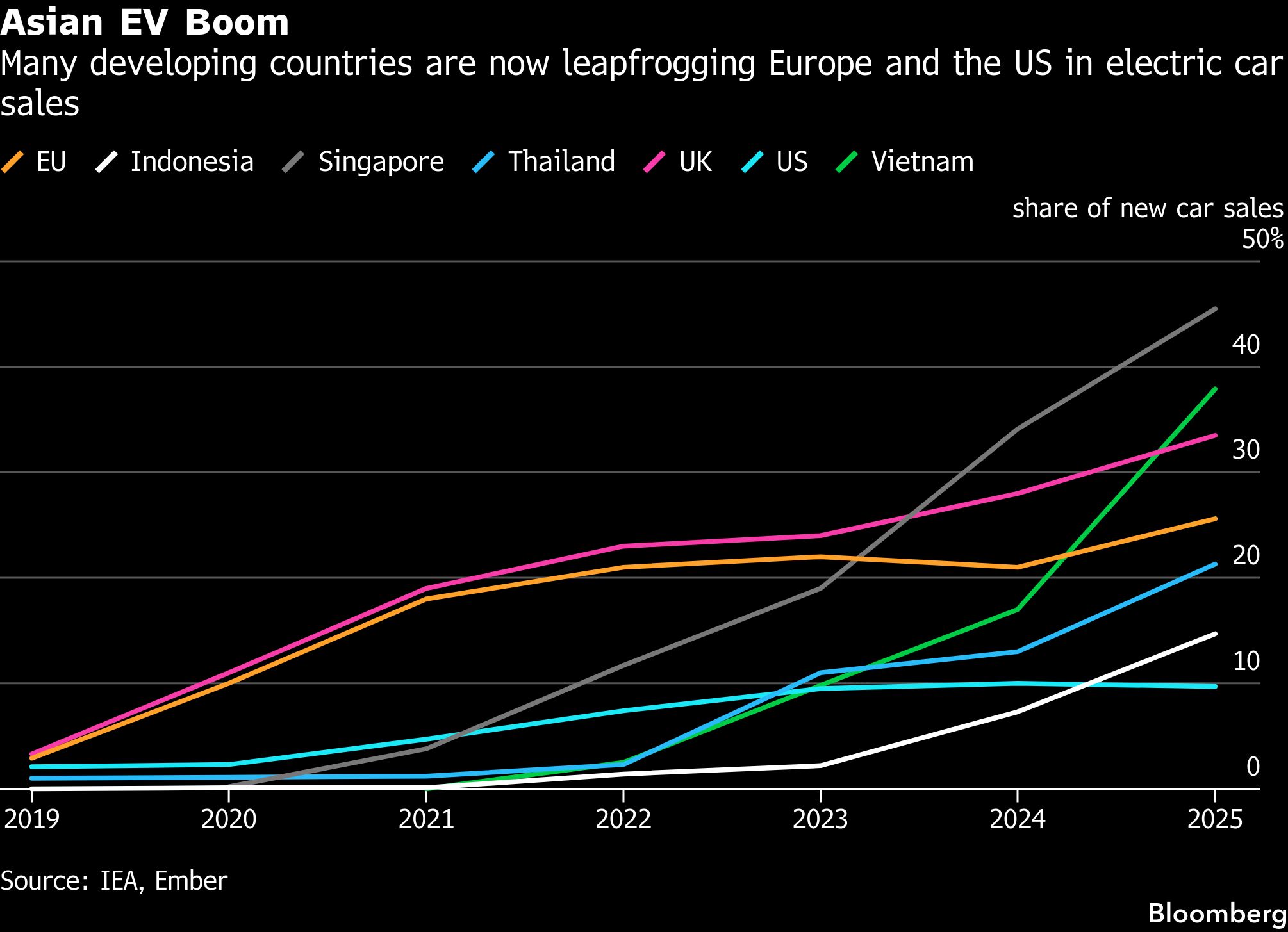 Pada 2025, Tiongkok mencapai lebih dari 50% penjualan kendaraan listrik untuk pertama kalinya, sementara pangsa tersebut adalah 38% di Vietnam dan 21% di Thailand.