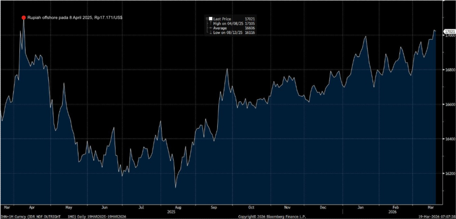 Pergerakan rupiah di pasar offshore di level Rp17.000-an/US$ sebenarnya bukan hal baru. Pada libur panjang Lebaran tahun lalu, nilai kontrak rupiah terhadap dolar AS sempat menembus Rp17.171/US$ pada 8 April 2025 dan menjadi level terendahnya sejak era Covid-19.