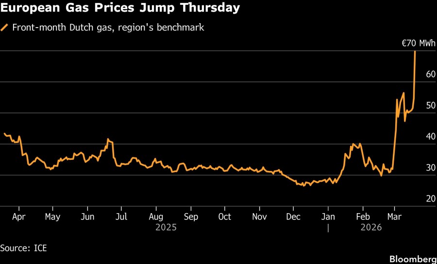 Kontrak berjangka bulan depan Belanda, acuan harga gas Eropa, diperdagangkan 23% lebih tinggi di €67,35 per megawatt-hour pada pukul 08.27 pagi di Amsterdam.
