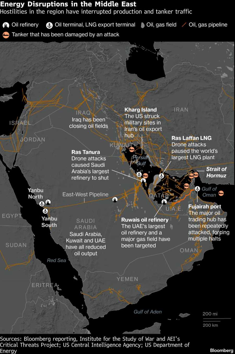 - Ras Tanura, Arab Saudi: Saudi Aramco sempat menghentikan operasional kilang pengolahan minyak mentah terbesar di kerajaan tersebut—berkapasitas 550.000 barel per hari—pada hari-hari awal perang. Fasilitas ini kini telah beroperasi kembali.