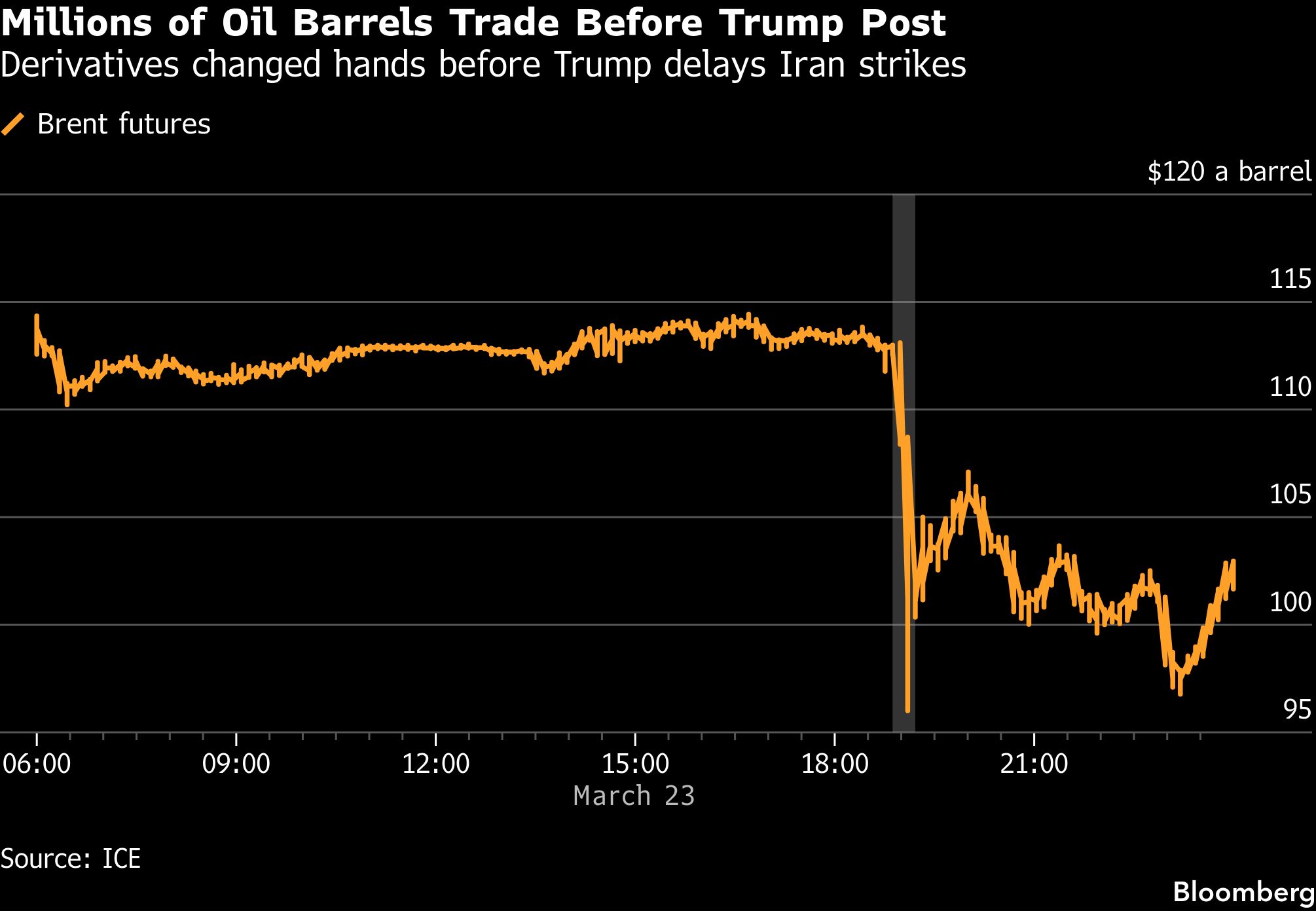 Kontrak berjangka yang sesuai dengan setidaknya 6 juta barel Brent dan West Texas Intermediate (WTI) terjual dalam dua menit mulai pukul 6:49 pagi di Washington pada Senin (23/3/2026) waktu setempat, menurut data bursa yang dikumpulkan oleh Bloomberg.
