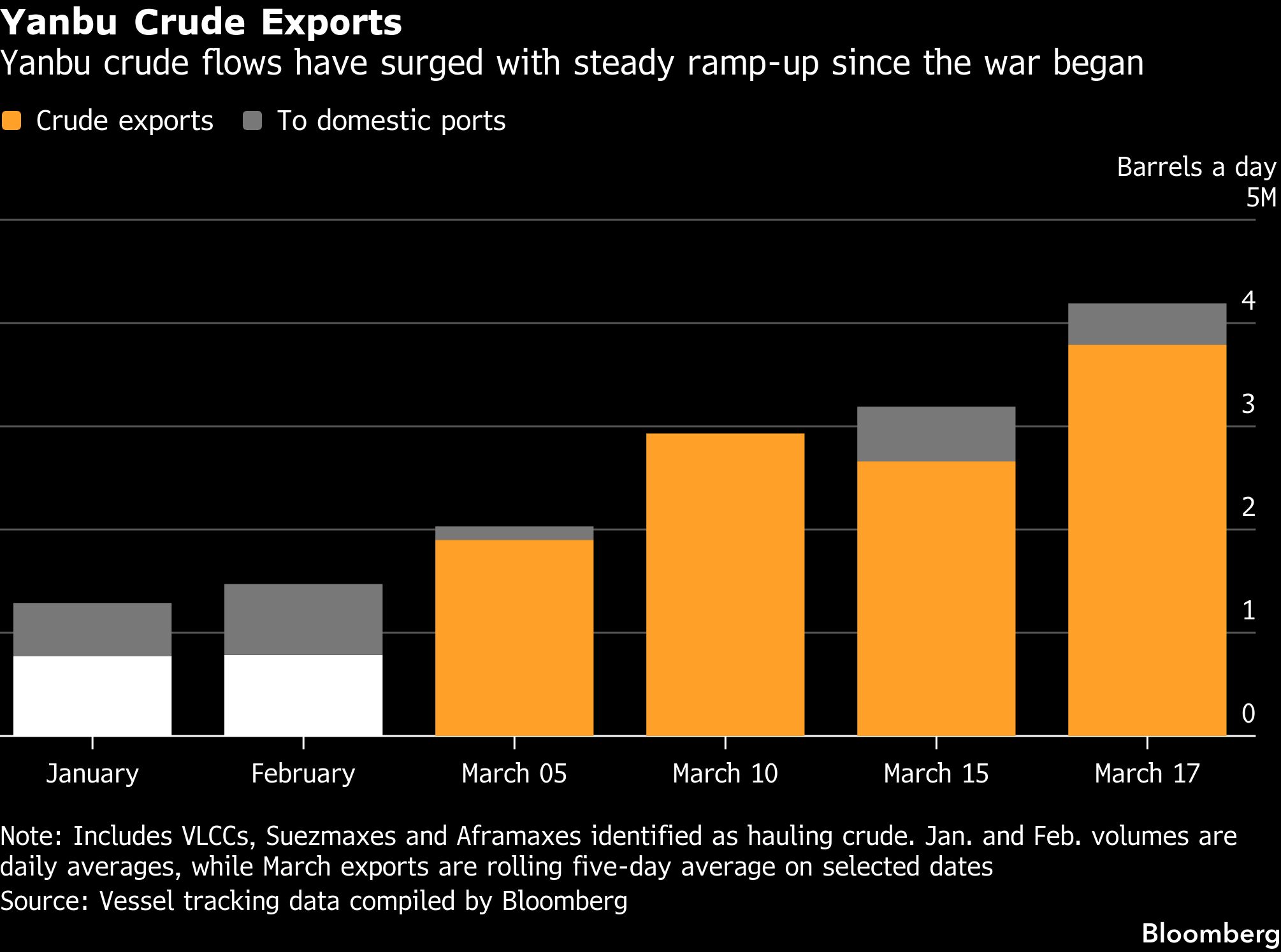 Ekspor Yanbu mencapai puncaknya sebesar 4,19 juta barel per hari (bph) pekan lalu, tetapi telah menurun sejak saat itu.