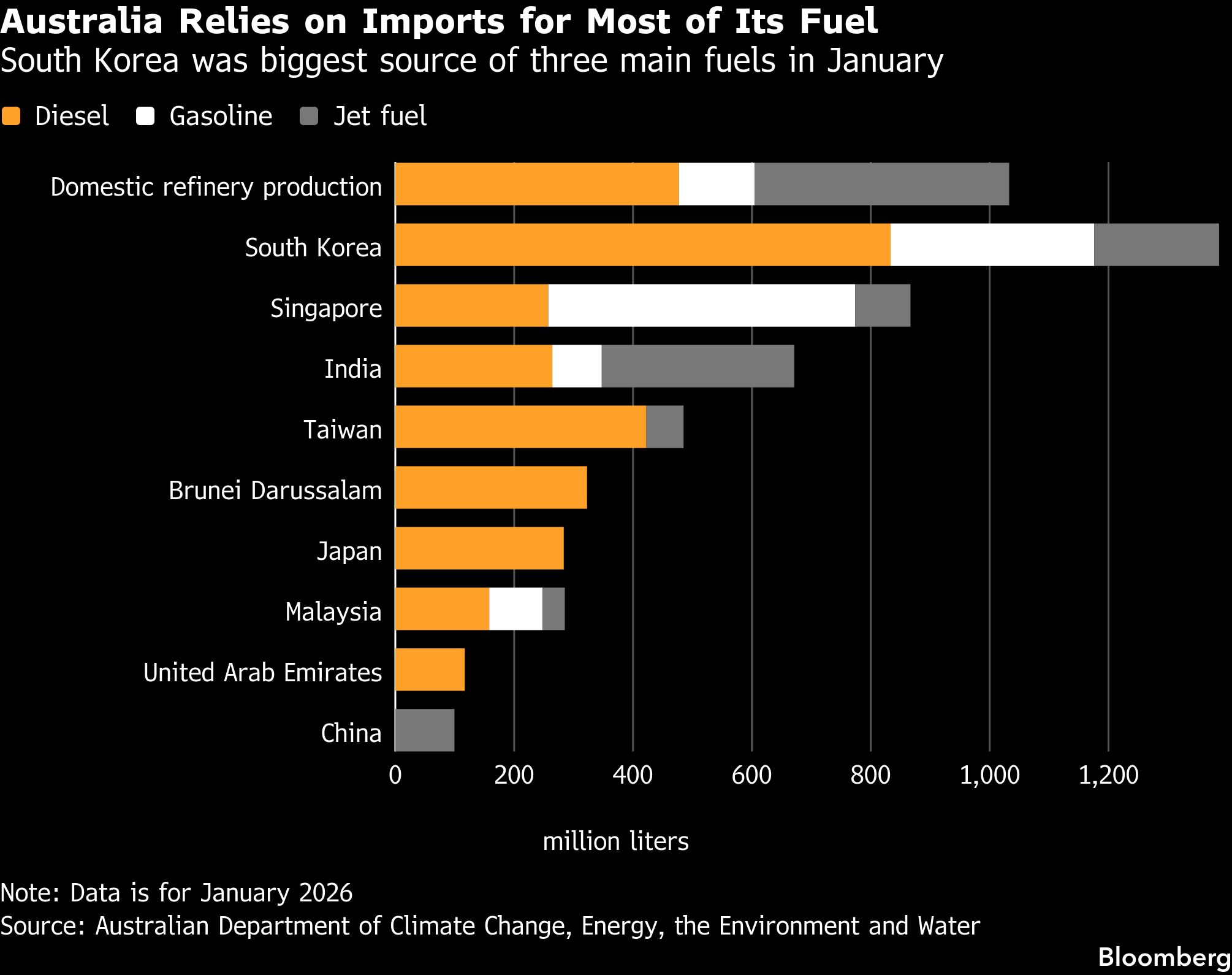 Dengan kapasitas kilang domestik yang terbatas, Australia mengimpor lebih dari dua pertiga bensin, solar, dan bahan bakar jetnya. Pemasok terbesarnya, Korea Selatan, telah mengatakan akan membatasi beberapa ekspor.