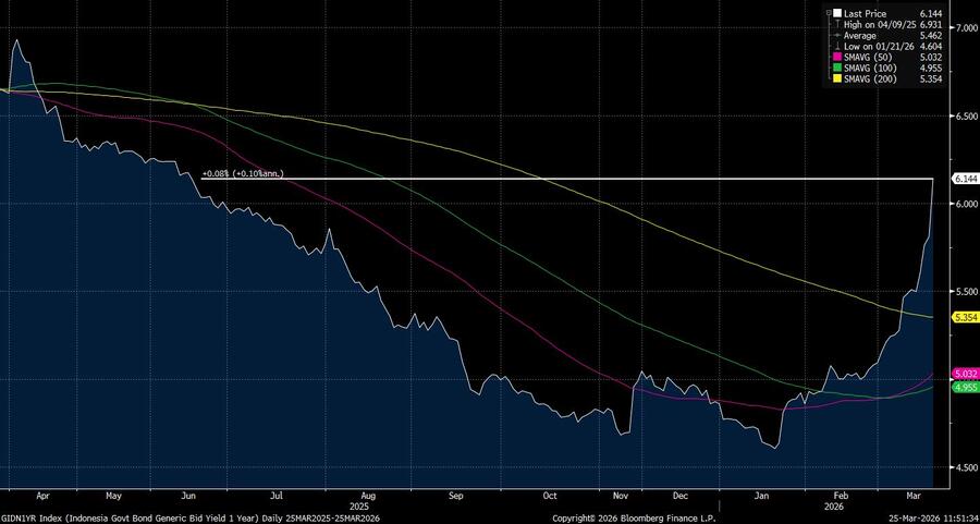 Pada perdagangan Rabu (25/3/2026) siang 11.50 WIB, yield SUN tenor 1Y naik 21,4 basis poin (bps) menjadi 6,14%. Ini merupakan yield tertinggi sejak Juni 2025. Tenor pendek lainnya seperti 3Y dan 4Y juga mengalami kenaikan masing-masing 14,2 bps dan 13,1 bps ke level 6,36% dan 6,6%. Begitu juga dengan tenor 5Y naik 11,4 bps ke 6,67%. Tekanan serupa terjadi pada tenor menengah. Yield 6Y naik 7,8 bps ke 6,89%, sementara 8Y naik 5,6 bps ke 6,95%.