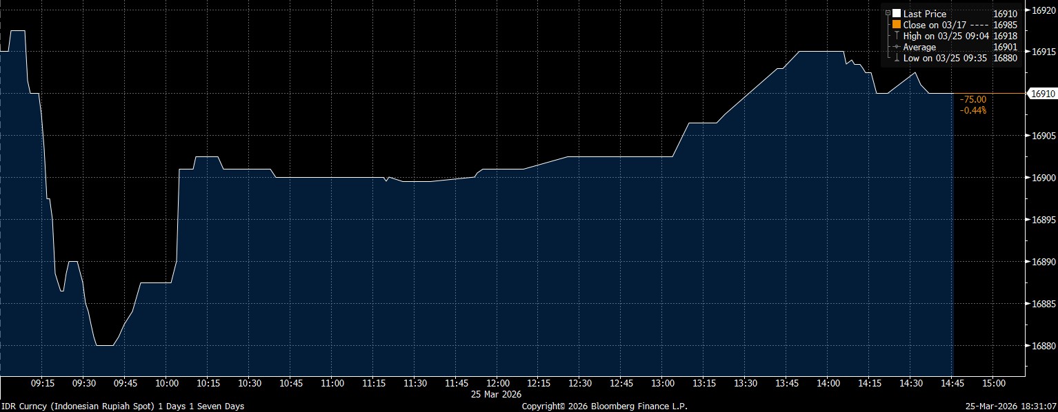 Pada tutup perdagangan di pasar spot, US$1 setara dengan Rp16.910. Rupiah menguat 0,44% point–to–point.