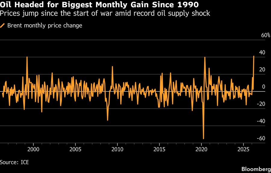 Patokan minyak mentah global berada di jalur untuk mencatat kenaikan bulanan terbesar sejak 1990 seiring konflik yang melanda Timur Tengah yang kaya energi dan menimbulkan guncangan di ekonomi global, dengan dampak yang sangat berat bagi Asia. Penutupan hampir total Selat Hormuz berarti hilangnya produksi minyak harian jutaan barel, sementara harga produk mulai dari solar dan bensin hingga bahan bakar jet melonjak tajam.