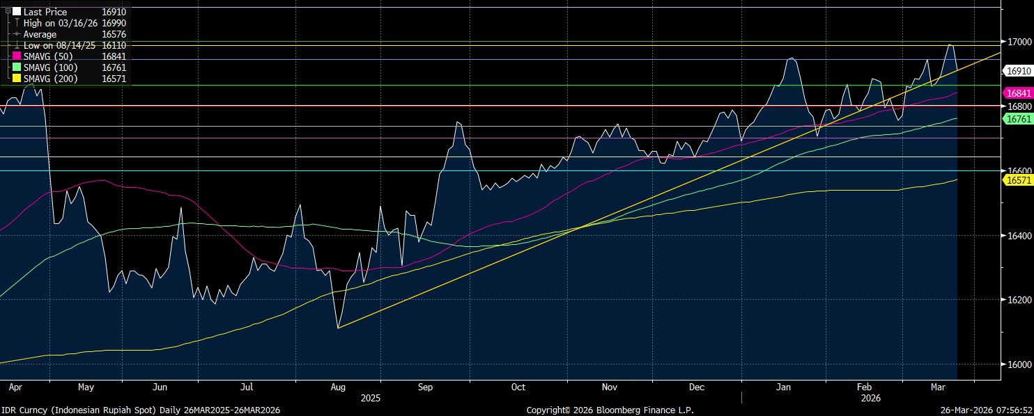 Secara teknikal, rupiah berpotensi melanjutkan tren penguatan hari ini. Adapun rupiah berpotensi menembus resistance terdekat di level Rp16.900/US$, dengan resistance potensial selanjutnya menuju Rp16.860/US$ usai break trendline sebelumnya.