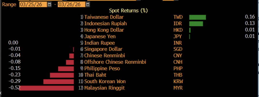 Indeks dolar AS kembali naik meski terbatas sebesar 0,02% ke 99,61 dan membuat beberapa mata uang di pasar Asia kembali melemah. Ringgit Malaysia melemah paling dalam sebesar 0,48%, disusul baht Thailand 0,38%, won Korea Selatan 0,34%, peso Filipina 0,17%, yuan offshore 0,08% dan yuan China 0,05%.