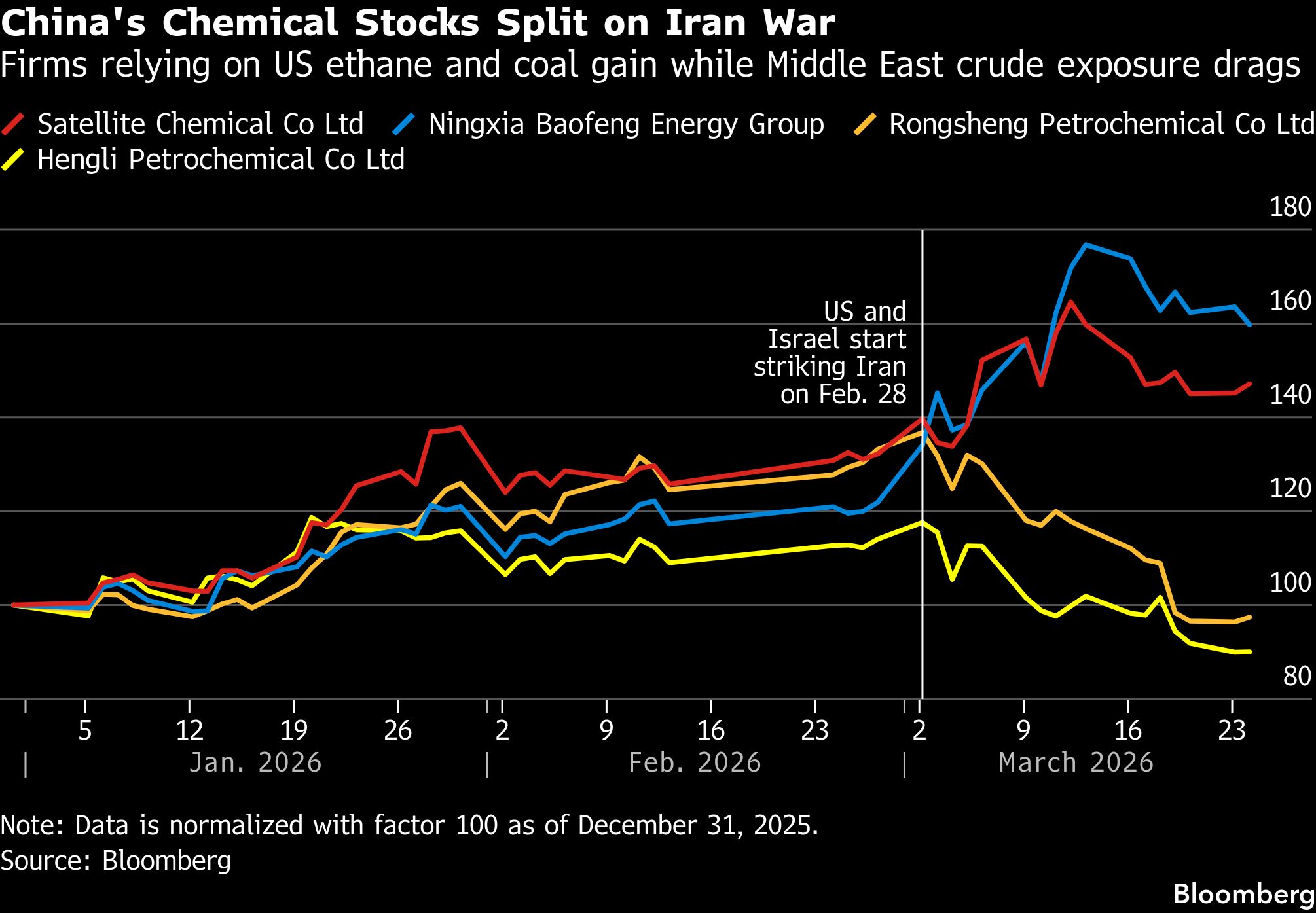 Saham Ningxia Baofeng Energy Group Co. yang banyak bergantung pada batubara dan Satellite Chemical Co. yang bergantung pada etana AS telah naik masing-masing 31% dan 11% sejak konflik dimulai, sementara Rongsheng Petrochemical Co. dan Hengli Petrochemical Co., keduanya bergantung pada minyak mentah Timur Tengah, telah turun masing-masing sekitar 23% dan 16%.