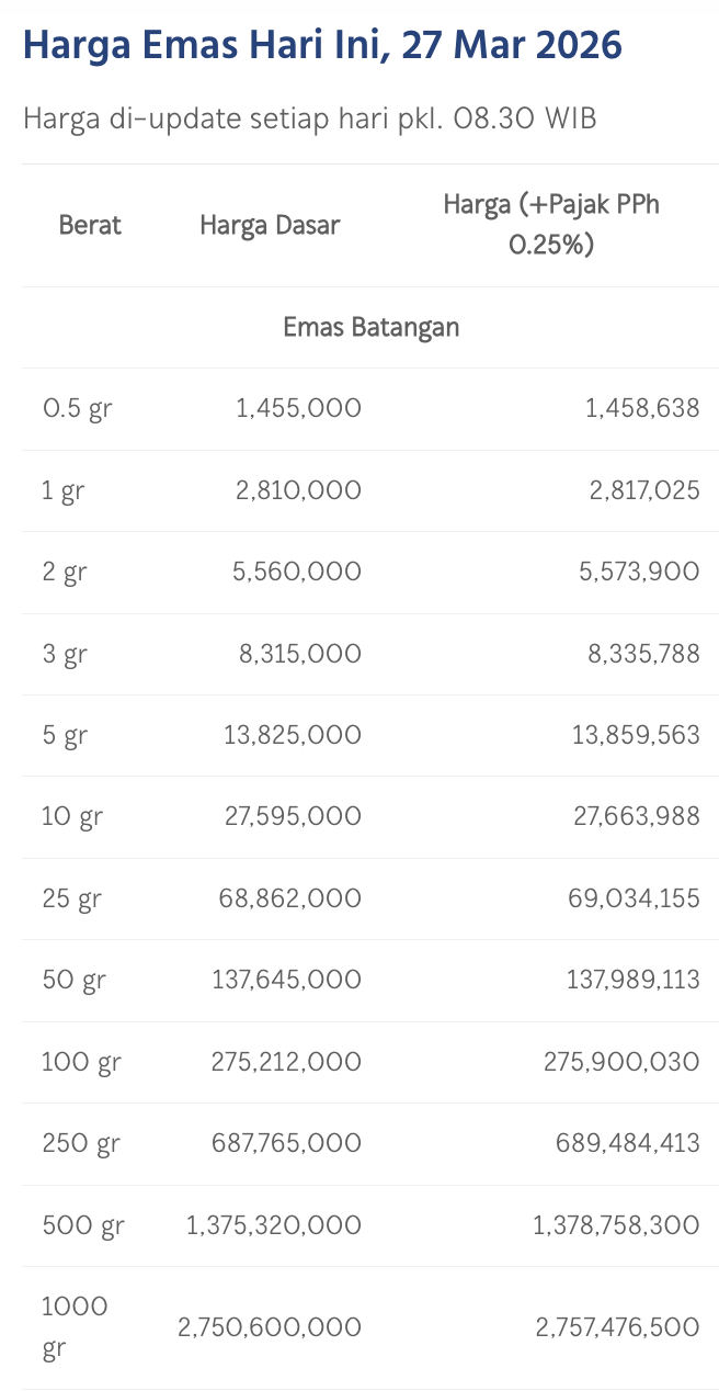 Pada Jumat (27/3/2026), emas Antam dihargai Rp 2.810.000/gram. Melemah Rp 40.000 dibandingkan posisi kemarin.
