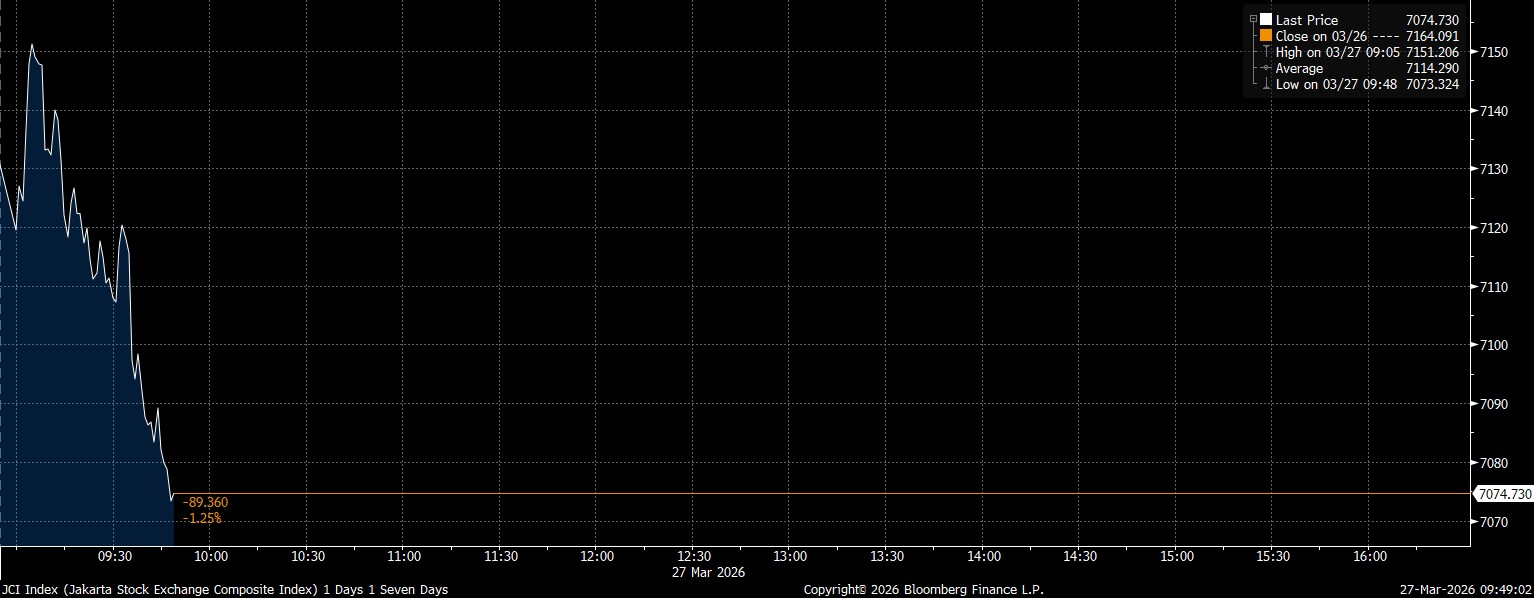 Bloomberg Technoz, Jakarta - Indeks Harga Saham Gabungan (IHSG) amblas di zona merah hingga tertekan amat dalam. IHSG melemah 89,36 poin atau jatuh mencapai 1,25% di posisi 7.074 pada pukul 9:50 WIB Sesi I pagi hari Jumat (27/3/2026).