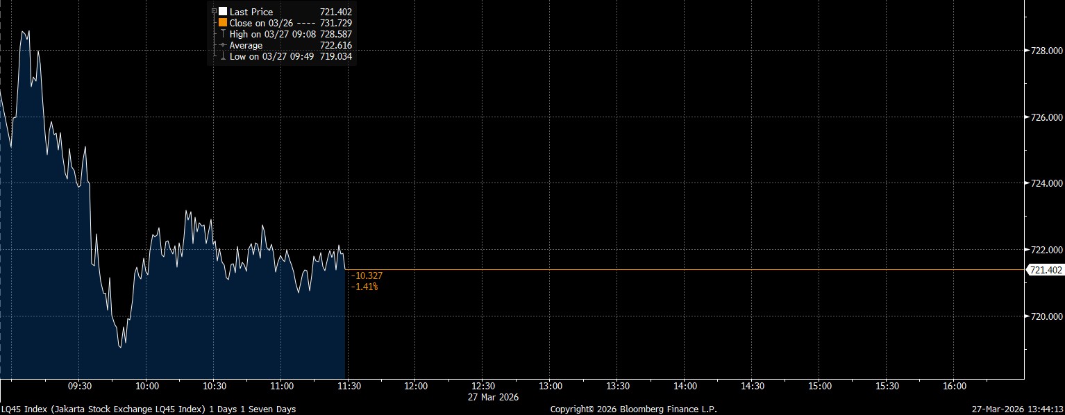 IHSG yang dibuka melemah pagi tadi dan tetap berada di zona merah hingga penutupan Sesi I. Pelemahan masih ditopang oleh kekhawatiran eskalasi tensi geopolitik menjelang ekspektasi serangan infrastruktur energi Iran serta harga minyak masih relatif tinggi saat ini.