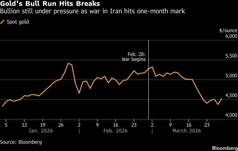 Sejak perang dimulai pada 28 Februari, harga emas telah turun hampir 15%, bergerak sejalan dengan saham dan berbanding terbalik dengan harga minyak. Emas batangan “diperdagangkan sebagai aset berisiko,” tulis analis TD Securities dalam catatan pada Jumat.