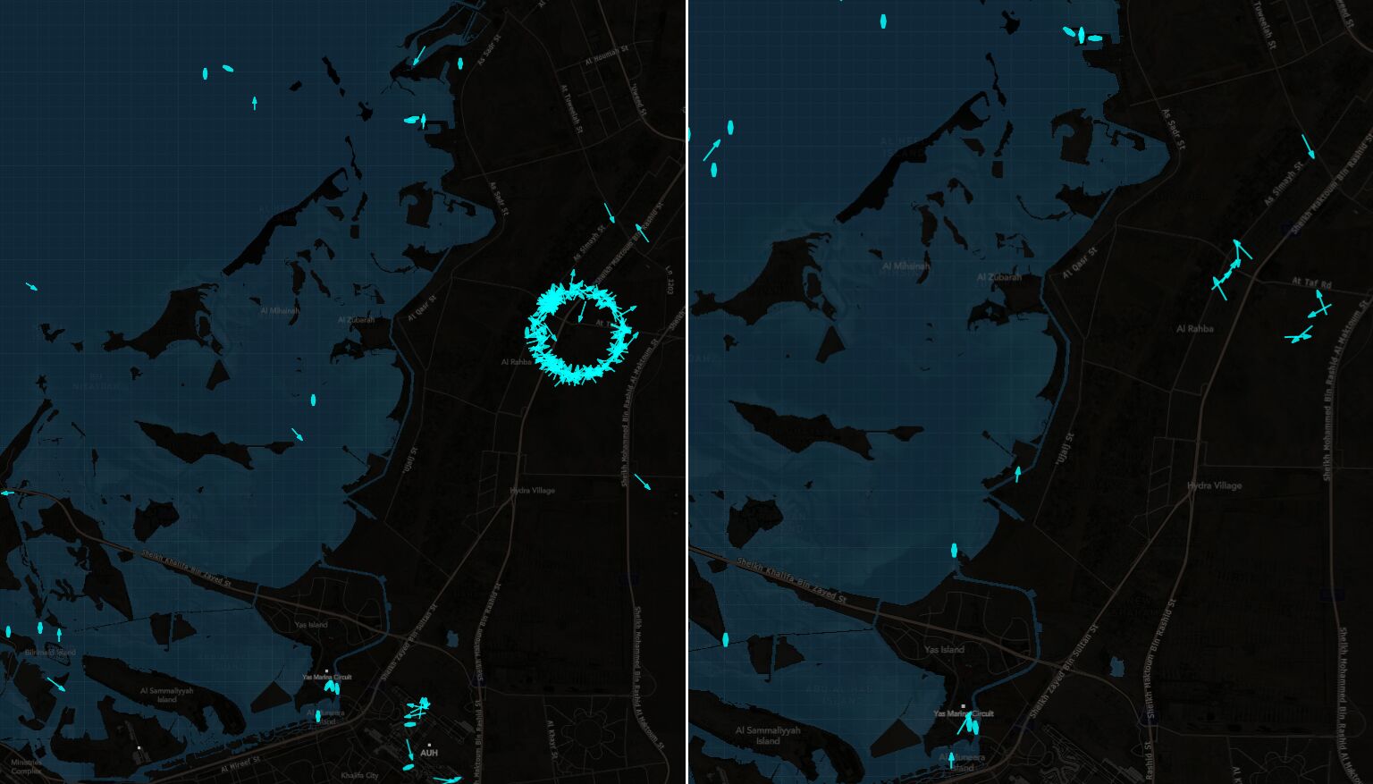 Sebagai contoh, kelompok besar ratusan kapal yang membentuk lingkaran hampir sempurna di daratan dekat Abu Dhabi yang terlihat pada 2 Maret menyusut menjadi kurang dari 10 pada Senin (30/3/2026).