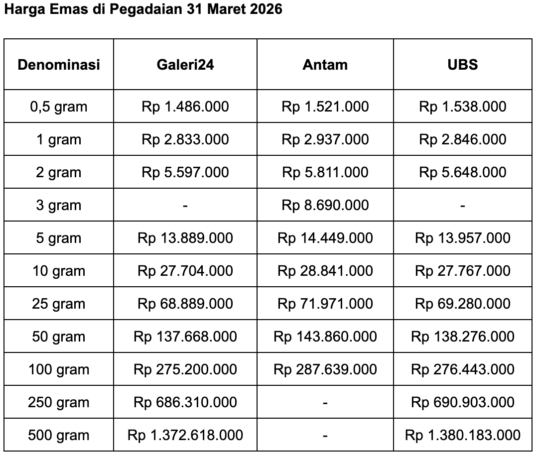 Pegadaian adalah salah satu anak usaha PT Bank Rakyat Indonesia (Persero) Tbk (BBRI). Berikut perkembangan harga emas di Pegadaian selengkapnya, seperti dilansir situs Sahabat Pegadaian: