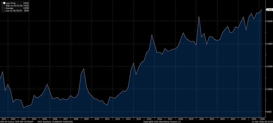 Di pasar offshore, Selasa (31/3/2026), rupiah telah menyentuh level psikologis Rp17.015/US$ pagi ini, setelah kemarin pada 16:20 WIB menyentuh level tertinggi sejak April 2025 di Rp17.048/US$. Pada 8 April tahun lalu, rupiah offshore sempat menyentuh level Rp17.105/US$.
