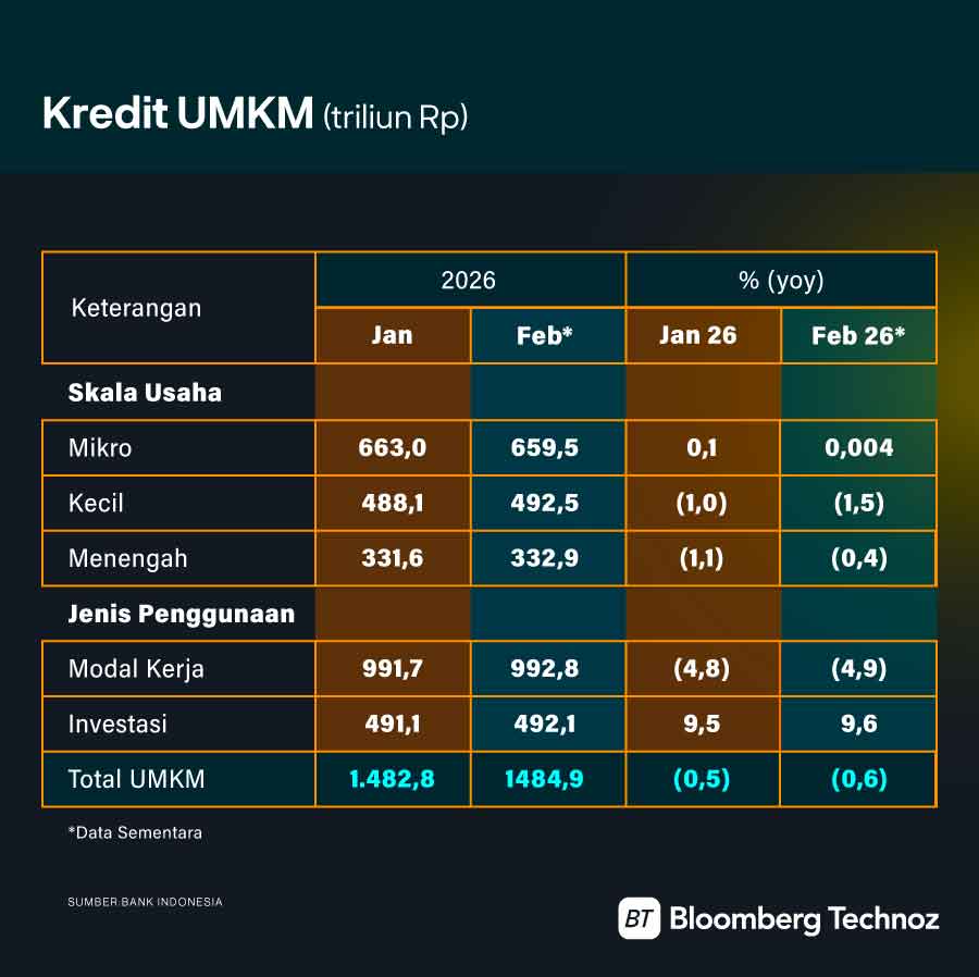 Melansir data Bank Indonesia (BI), kredit pada sektor Usaha Mikro Kecil dan Menengah (UMKM) pada Februari 2026 terkontraksi 0,6% secara tahunan (year-on-year/yoy), melanjutkan kontraksi bulan sebelumnya sebesar 0,5%. Hal ini mengindikasikan bahwa sektor riil, khususnya UMKM mulai kehabisan napas.