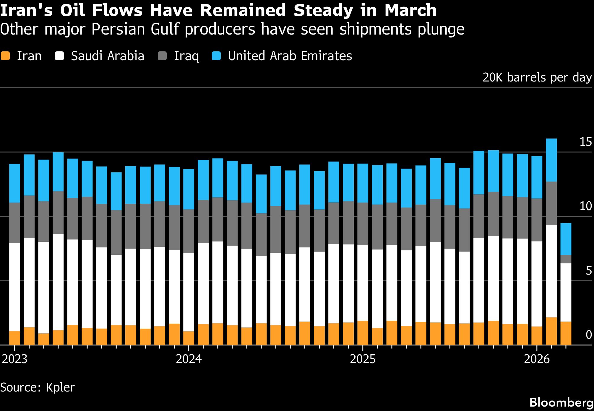 Sebaliknya, ekspor pada bulan yang sama dari Irak, yang terletak jauh di Teluk Persia, anjlok lebih dari 80% dibandingkan dengan level 2025, sementara Arab Saudi lebih dari seperempat di bawah rata-rata tahun lalu — bahkan dengan bantuan pipa yang mengangkut minyaknya ke Laut Merah.