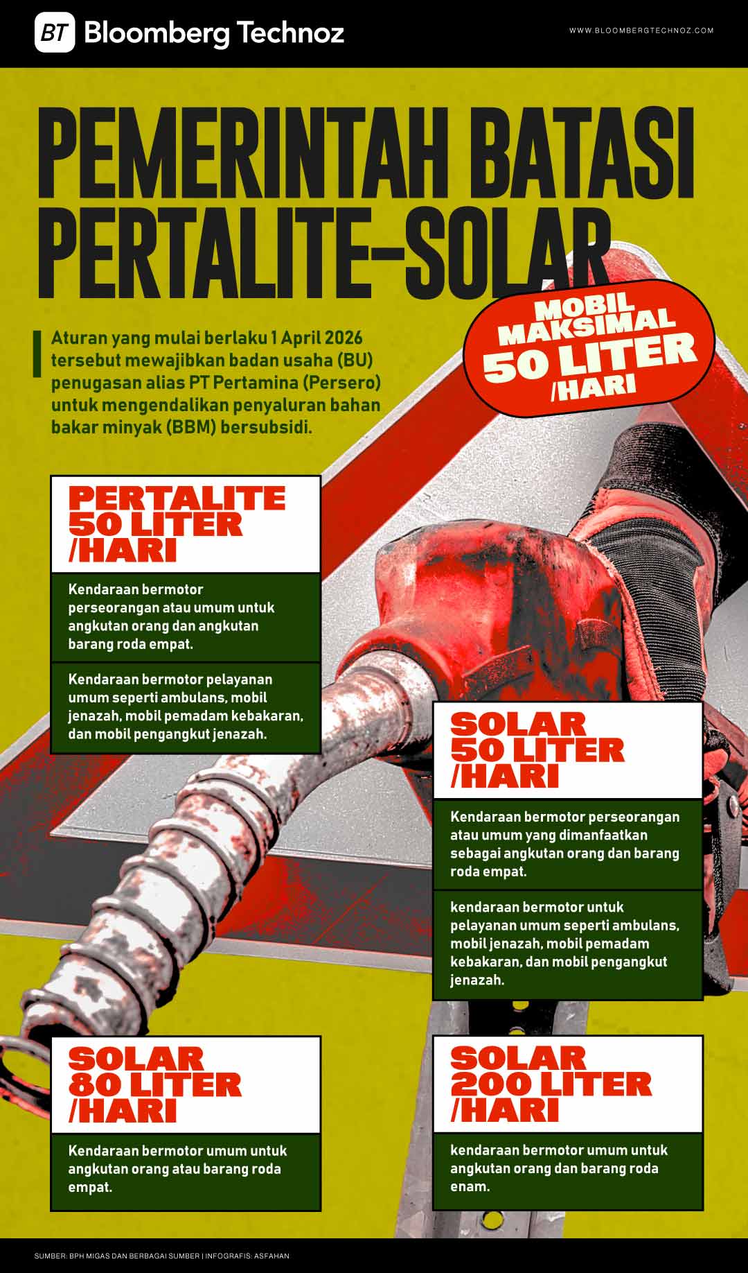 Untuk Solar, BU penugasan wajib melakukan pengendalian penyaluran Solar untuk kendaraan bermotor perseorangan atau umum yang dimanfaatkan sebagai angkutan orang dan barang roda empat paling banyak 50 liter/hari untuk setiap kendaraan.