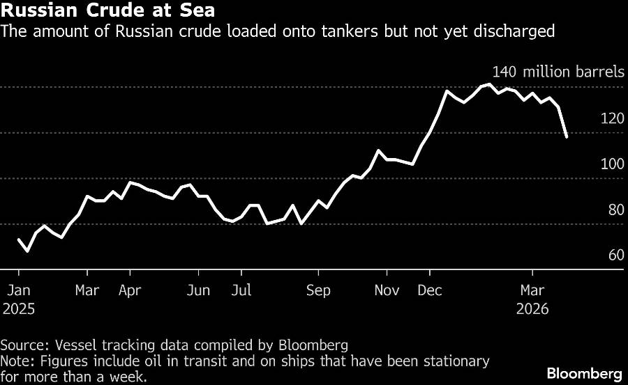 Hal itu mulai menguras stok minyak mentah Rusia di laut, yang mencapai puncaknya sekitar 140 juta barel pada Januari. Hingga Minggu, jumlah minyak mentah di laut telah turun kembali di bawah 120 juta barel, dengan pengiriman melampaui pengiriman.