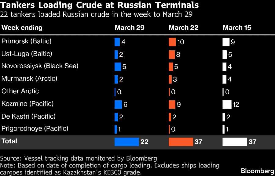 Sebanyak 22 kapal tanker memuat 16,23 juta barel minyak mentah Rusia pada pekan yang berakhir 29 Maret, menurut data pelacakan kapal dan laporan agen pelabuhan. Volume pengiriman turun tajam dari 28,5 juta barel pada 37 kapal pada minggu sebelumnya.