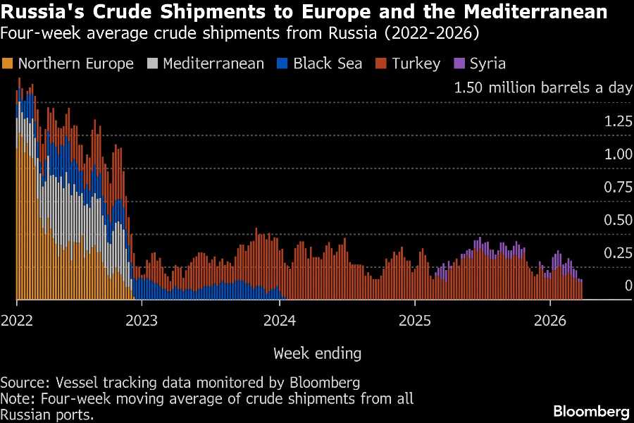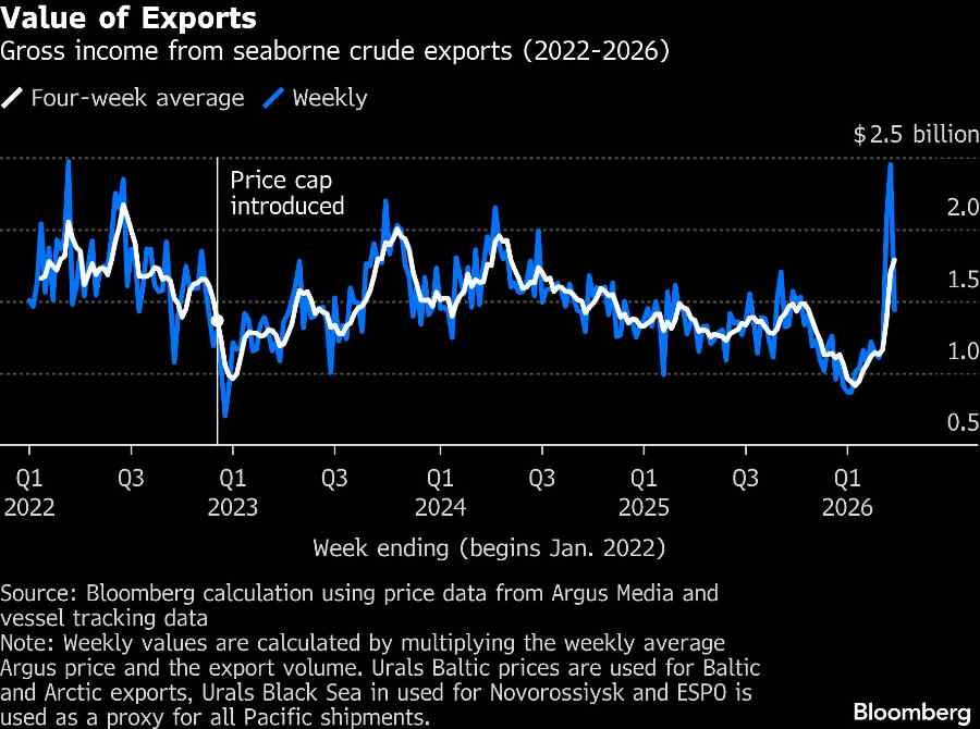 Berdasarkan rata-rata empat minggu, nilai bruto ekspor Moskwa naik tipis menjadi US$1,79 miliar per minggu dalam 28 hari hingga 29 Maret, dari US$1,7 miliar pada periode hingga 22 Maret. Angka ini menandai level tertinggi sejak Mei 2024, dengan harga yang lebih tinggi lebih dari mengimbangi penurunan volume ekspor.