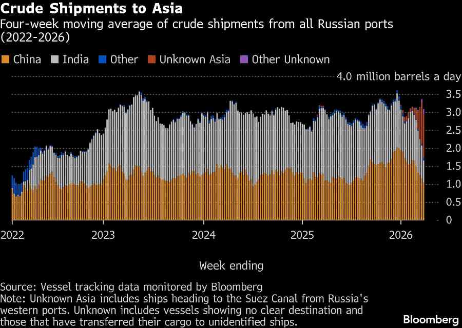 Meski jumlah minyak mentah Rusia di kapal tanker yang menunjukkan tujuan China dan India terus menunjukkan penurunan tajam dalam beberapa minggu terakhir, volume di kapal yang belum menunjukkan tujuan akhir melonjak, memungkinkan sebagian besar pola tersebut berbalik seiring waktu.