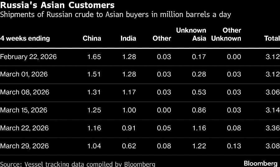 Pengiriman yang teramati ke pelanggan Rusia di Asia, termasuk yang tidak menunjukkan tujuan akhir, turun menjadi 3,08 juta barel per hari dalam 28 hari hingga 29 Maret, sejalan dengan penurunan pengiriman secara keseluruhan.