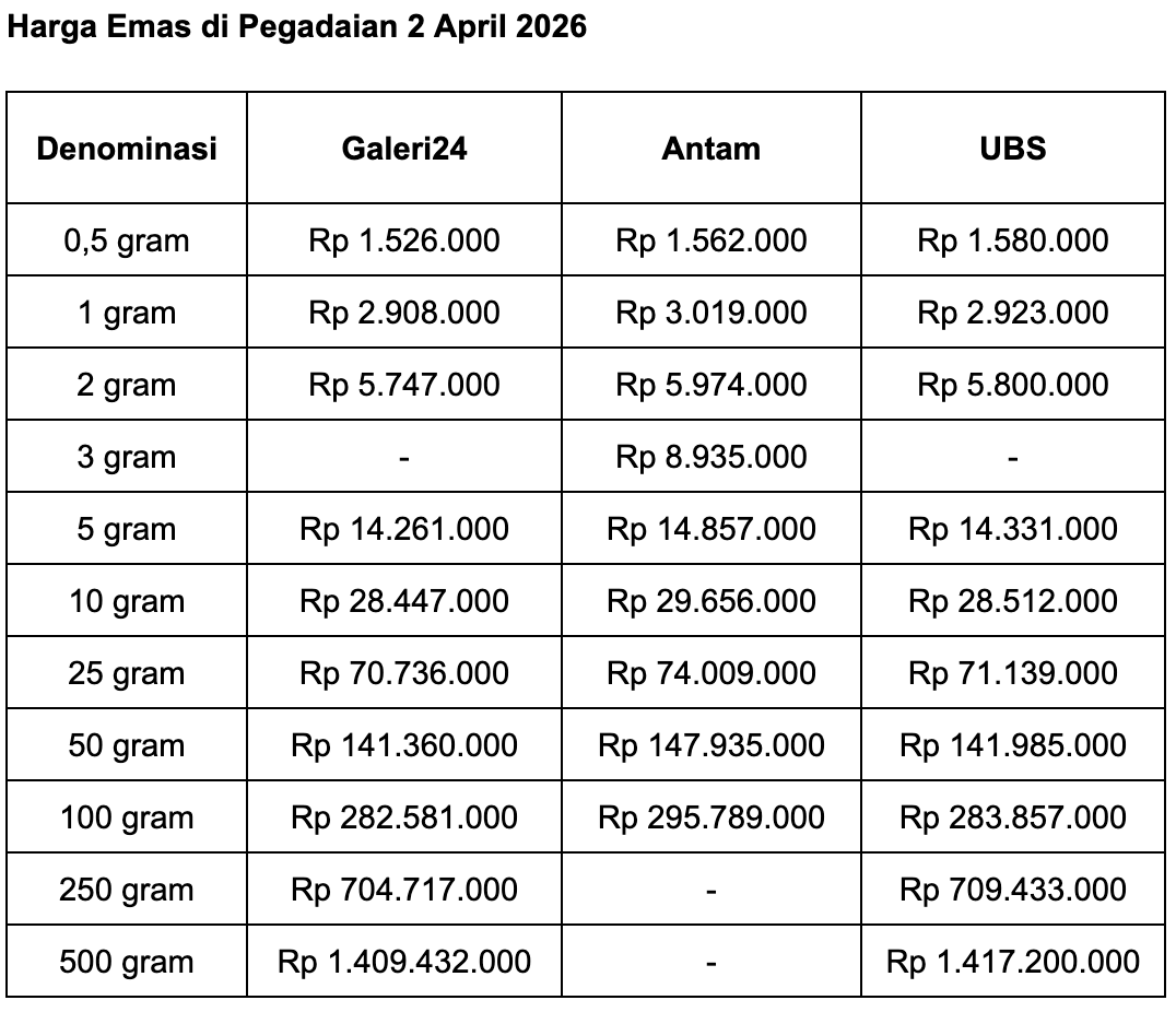 Adapun untuk ukuran 1 gram, harga emas Galeri 24 di Pegadaian adalah Rp 2.908.000. Terkerek Rp 64.000 dari hari sebelumnya.