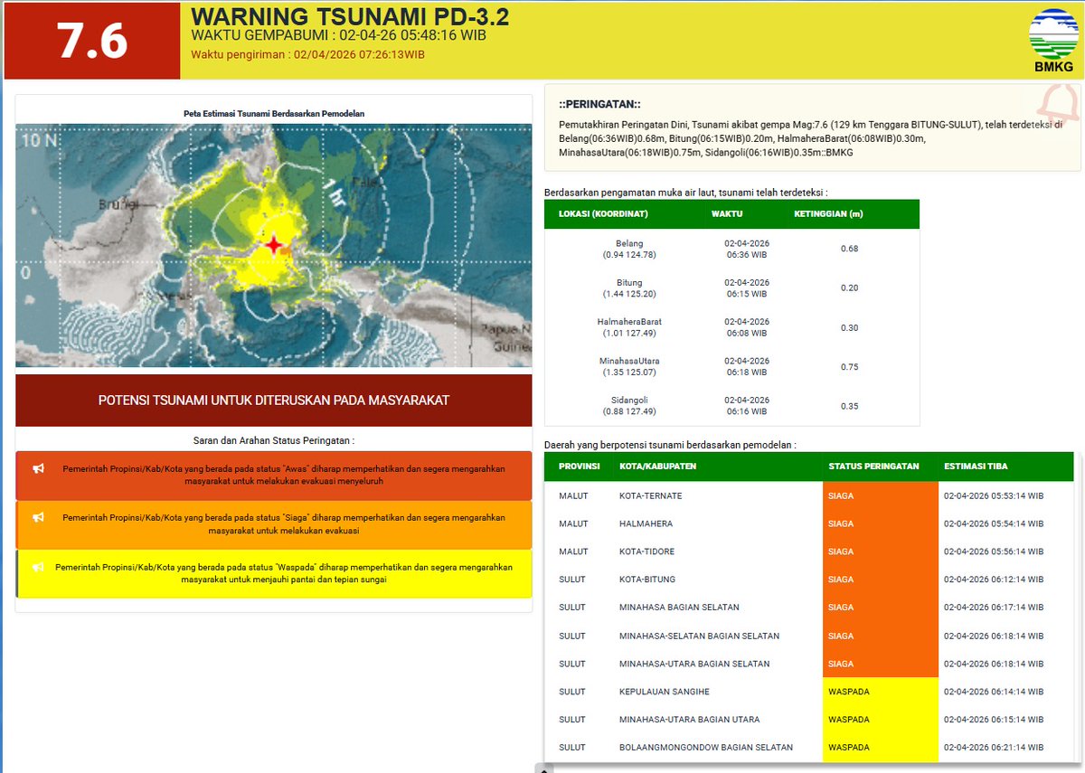 Bloomberg Technoz, Jakarta - BMKG mengeluarkan status peringatan dini tsunami setelah gempa berkekuatan SR 7,6 terjadi di Malut, Sulawesi Utara. 10 kota/kabupaten berstatus siaga dan waspada.