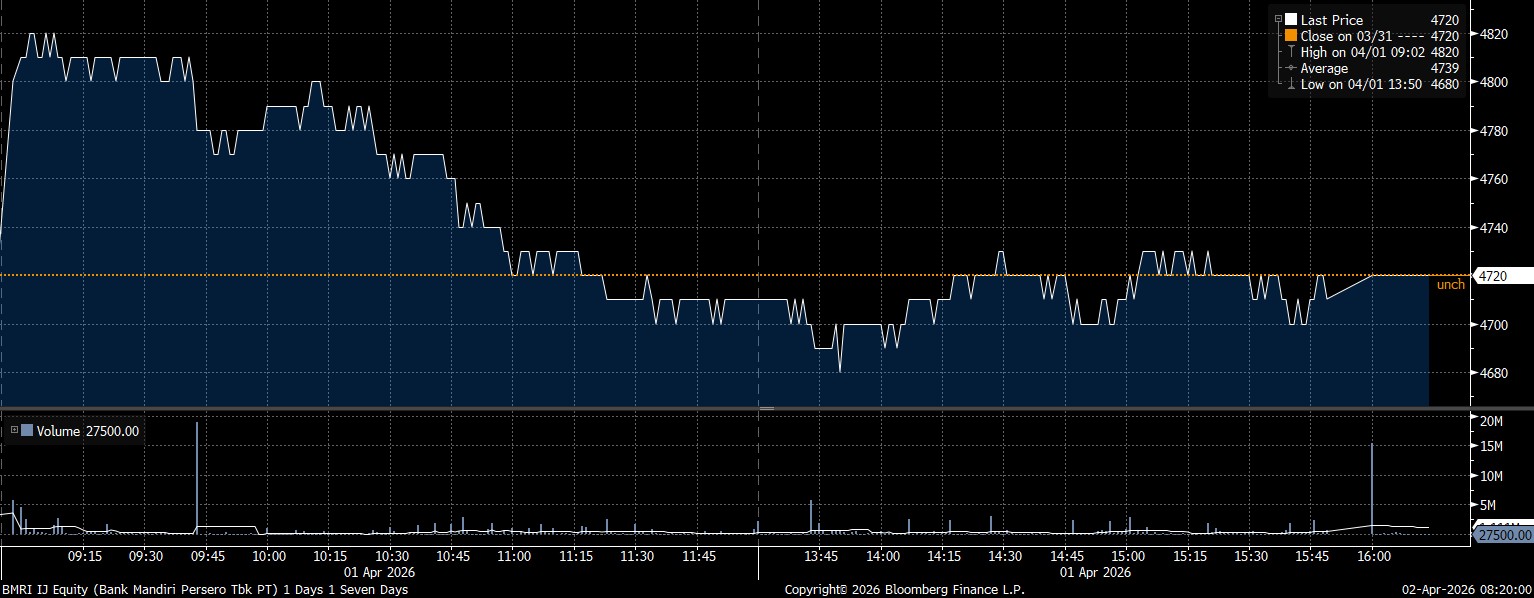 Adapun investor asing net sell terbesar di saham PT Bank Mandiri Tbk (BMRI) mencapai Rp374,03 miliar. Imbas tekanan jual, saham BMRI enggan melaju hingga tertahan di posisi Rp4.720/saham.